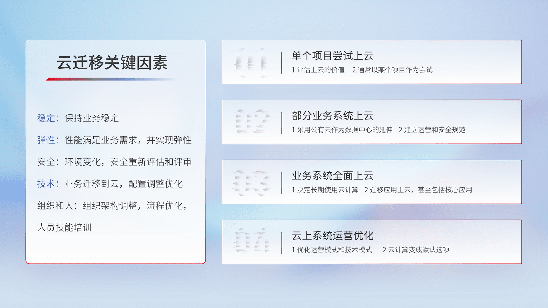 结合实际业务,,,,从规划设计、、、云平台选型、、、云原生改造、、、数据迁移、、、集成交付,,,迁移全过程为客户识别最佳上云路径,,,做好风险识别管理,,,设计网络架构、、身份权限、、、、安全审计合规、、操作审计、、、、日志审计、、监控告警策略、、、多站点容灾设计等,,对云上基础设施进行整体规划,,,提升IT治理水平,,,,以满足弹性、、、、高可用、、、、高性能的需求。。