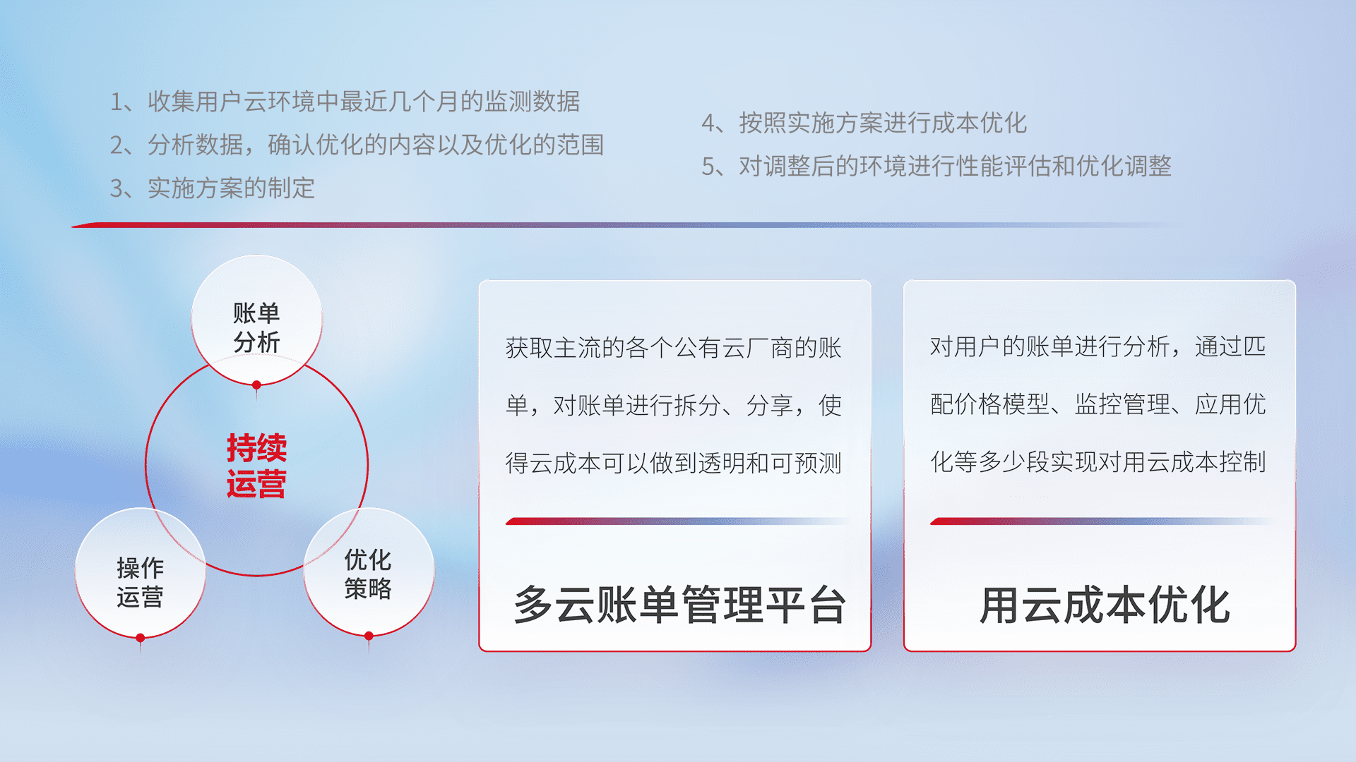 通过多云纳管,,,以统一的资源数据模型把客户的云资源进行抽象和封装,,,,进而实现对多云资源的统一操作,,,,保障云资源管理的可靠性、、、稳定性与可用性。。。。量身定制化运维内容,,,,配置、、开发运维、、、补丁管理、、备份、、监控、、、认证和访问管理、、、、审计和日常巡检等,,,,保障在用云过程中的可靠度,,,稳定度以及高可用率。。